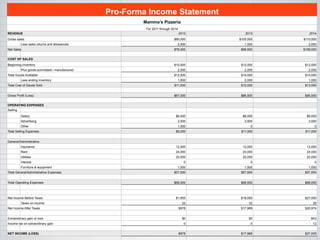 The document contains sales forecasts and pro-forma income statements for Mamma's Pizzeria from 2011-2014. The 1st quarter sales forecast shows sales declining from 30 to 8 units over the year. The income statements show gross sales increasing from $80,000 in 2012 to $110,000 in 2014, with net income also increasing over the years from $978 in 2012 to $27,005 in 2014. Operating expenses remained mostly stable while revenue increased.