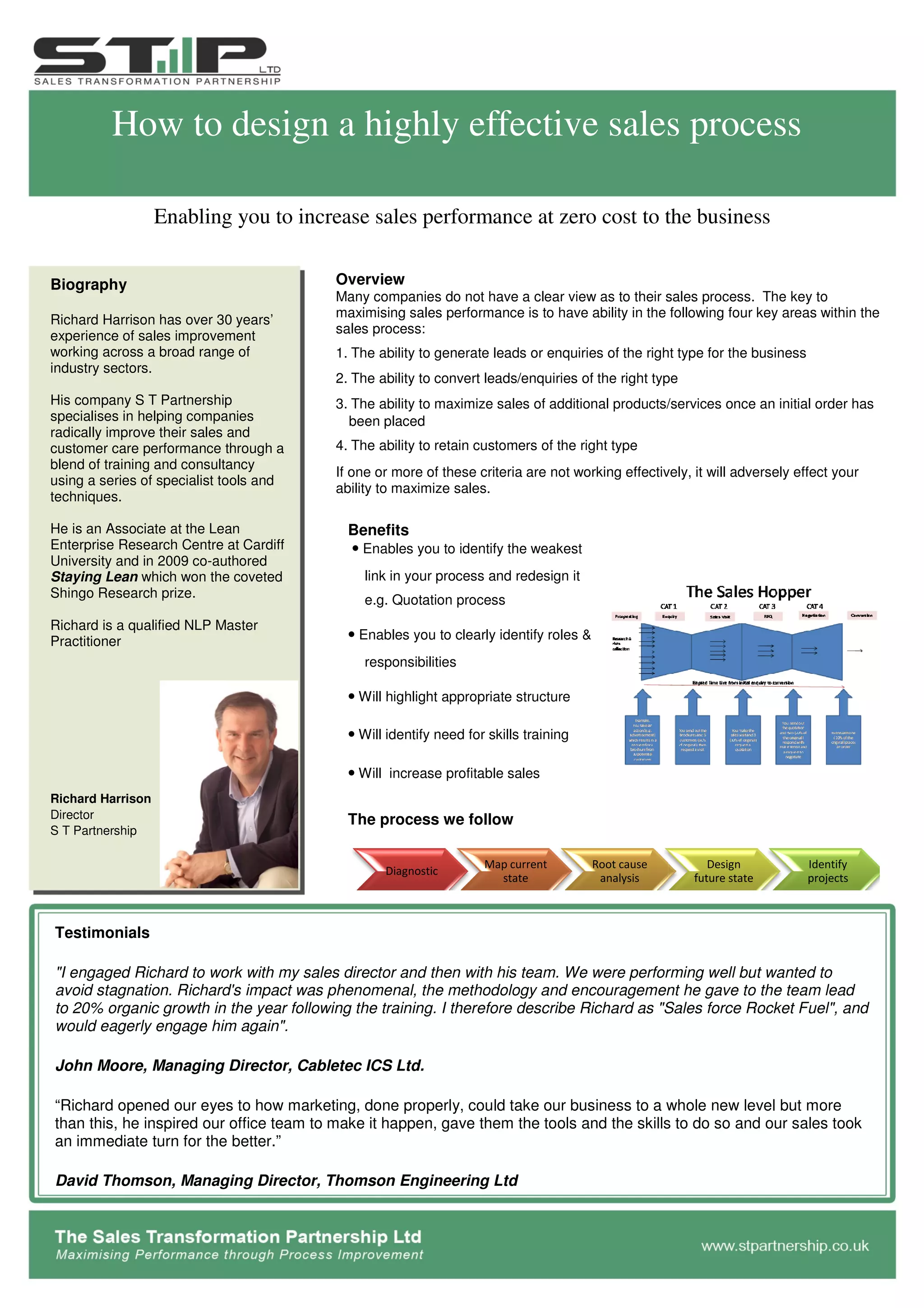 The document outlines a process for designing a highly effective sales process that can increase sales performance without additional costs. It involves analyzing a company's current sales process in four key areas: lead generation, lead conversion, additional product sales, and customer retention. Weaknesses are identified and the process is redesigned, with roles and responsibilities clarified. This enables companies to maximize profitable sales.