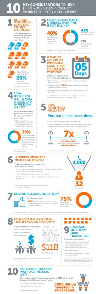 This document provides 10 key considerations for making a sales team more productive. It finds that salespeople spend less than half their time selling, with much of the remaining time spent on administrative tasks, internal meetings, and creating sales materials. It emphasizes the importance of salespeople being well-prepared for client meetings, following up with clients multiple times, using social media effectively, and maintaining job satisfaction. The document concludes by noting that companies invest large sums in their sales teams and that productivity solutions can help salespeople reduce wasted time and focus on selling.