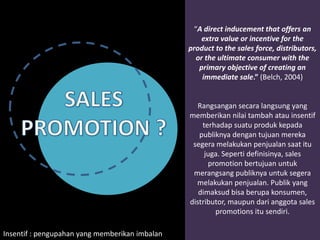 Dokumen tersebut membahas tentang sales promotion, termasuk definisi, tujuan, peran, cara kerja, aspek penting, dan jenis-jenisnya baik yang berorientasi konsumen maupun pedagang. Sales promotion bertujuan untuk merangsang pembelian produk secara langsung dengan menawarkan nilai tambah kepada konsumen, pedagang, maupun tim penjualan.