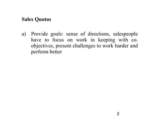 The document discusses sales quotas, including their purposes of providing goals and standards for measuring performance. It provides examples of quotas set for individual salespeople and compares their actual sales to their quotas. The document also discusses factors to consider for setting good quotas, such as ensuring they are fair, challenging, and help achieve management goals. Methods for setting quotas include using sales forecasts, past performance, and executive judgment. Proper administration of quotas includes motivating salespeople and keeping them updated on their quotas.