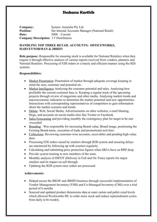 This document contains a summary of Shobana Karthik's personal and professional details. It outlines her educational background including a Master's degree in Human Resources and Bachelor's degree in English Literature. Her current role is a Senior Internal Accounts Manager at Synnex Australia Pty Ltd where she manages top retail accounts. Previous roles include positions at Computer Share Investors Pty Ltd and food service roles. The document details her objectives, skills, employment history and responsibilities in her current and past positions.