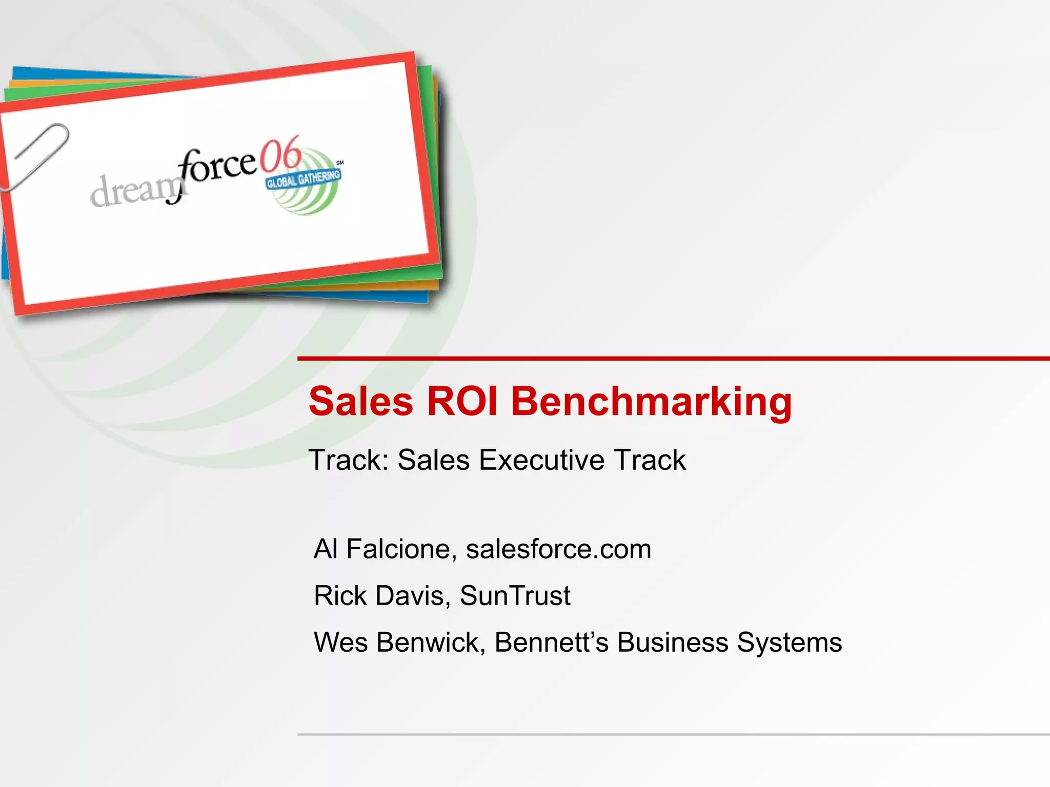 The document discusses an agenda for a sales ROI benchmarking track at a conference. It includes a safe harbor statement, outlines the agenda which will discuss ROI case studies from SunTrust Bank and Bennett's Business Systems, and provides contact information for the presenters. Key metrics for an ROI model are identified such as satisfied customers, leads, deals closed, and case resolution rates. The document also discusses how Salesforce can help improve these metrics.
