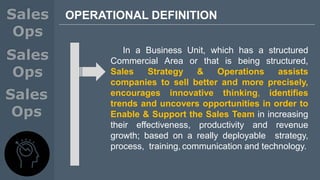 Sales Strategy & Operations assists companies to increase sales effectiveness, productivity and revenue growth through deployable strategies, processes, training, communication and technology. It aims to enable and support the sales team by acting as an advisor to commercial leadership. Key roles include managing the sales pipeline and forecasts, customer success, sales enablement through training and coaching, and ensuring consistent control, reporting and alignment through sales methodology, process engineering and performance management. The purpose is to establish a structured and scalable sales organization that delivers predictable revenue growth and creates loyal customers through continuous improvement.