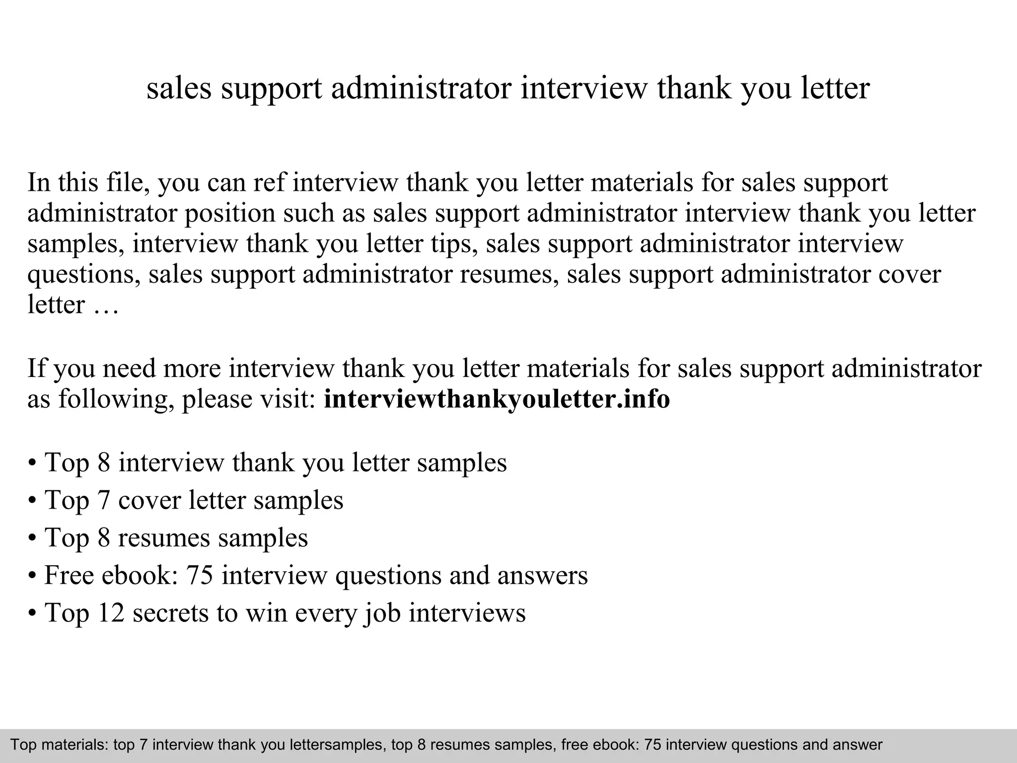 The document provides resources for writing a thank you letter after an interview for a sales support administrator position. It includes samples of thank you letters, tips for writing an effective letter, and links to additional job search materials like resume samples, cover letters, interview questions and answers. The goal of the letter is to express appreciation for the interviewer's time and reiterate your interest, qualifications, and enthusiasm for the role. It should be sent promptly after the interview while the position is still fresh in the interviewer's mind.