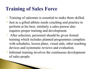 1. Sales training is essential to develop salespeople's skills through both formal and informal methods such as orientation, coaching, and continuing education.