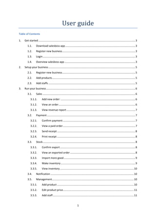 The document is a user guide for the Salesboss app, which allows businesses to manage sales, payments, stock, and other operations. It provides instructions on how to download the app, register a business, add products and staff, make sales and receive payments, manage inventory, and configure business and user settings. The guide is organized into sections on getting started, setting up a business, running business operations, and managing the business and user accounts.