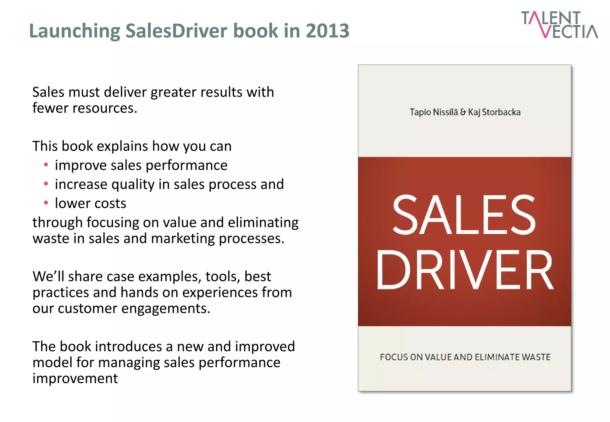 This document summarizes a book called SalesDriver that provides a method for improving sales performance and lowering costs through focusing on value and eliminating waste. The method is based on best practices from manufacturing and proven sales methodologies. It introduces a new model for managing sales that has been applied successfully in customer engagements. The book will share case studies and tools to help readers design and implement an effective sales management system aligned with their organization's strategy and objectives.