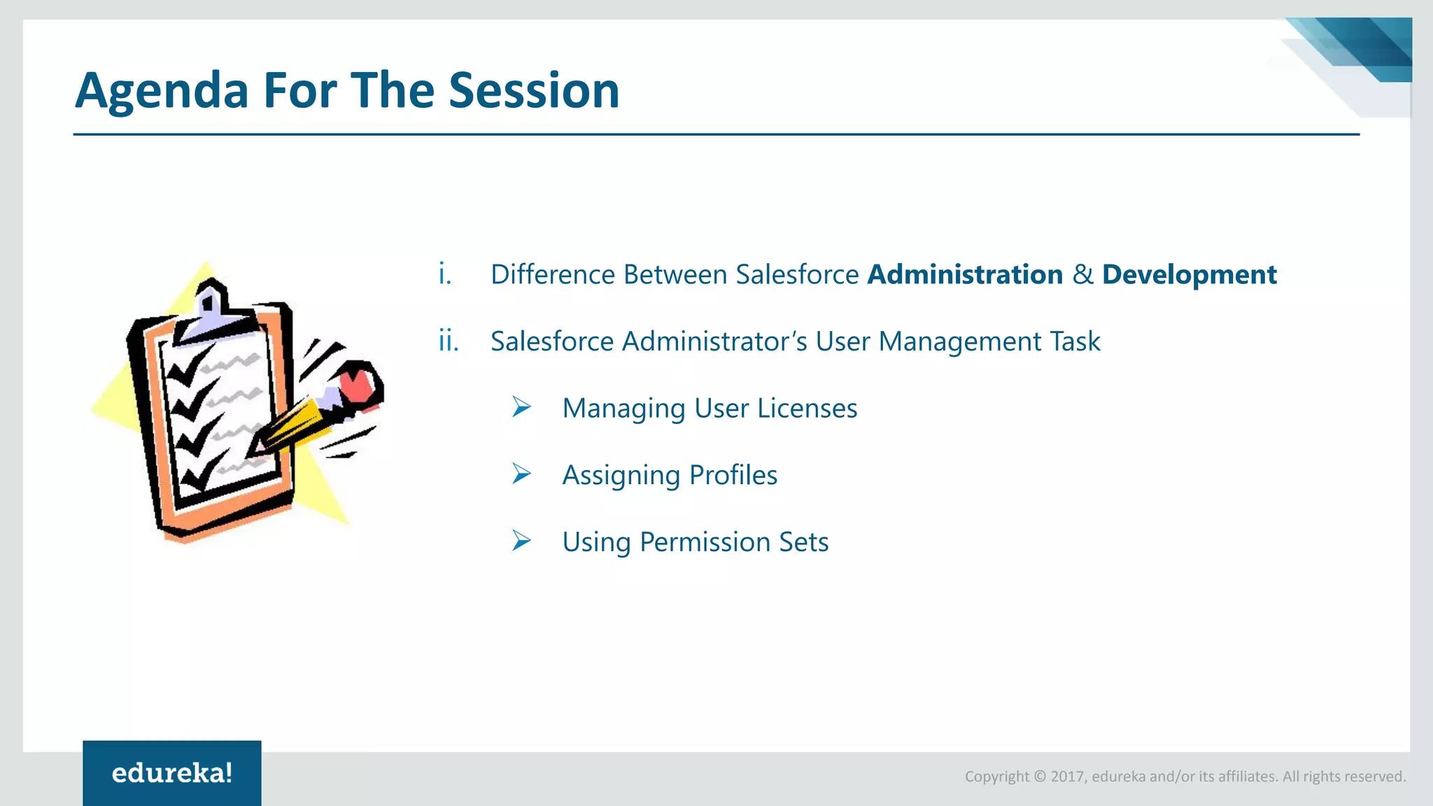 The document discusses the roles of Salesforce administrators and developers, highlighting the responsibilities of managing users and assigning profiles within Salesforce. It explains that administrators control user access and can utilize permission sets to grant additional functionality beyond standard profiles. The session also covers hands-on tasks involving managing licenses, profiles, and permission sets to streamline user management.