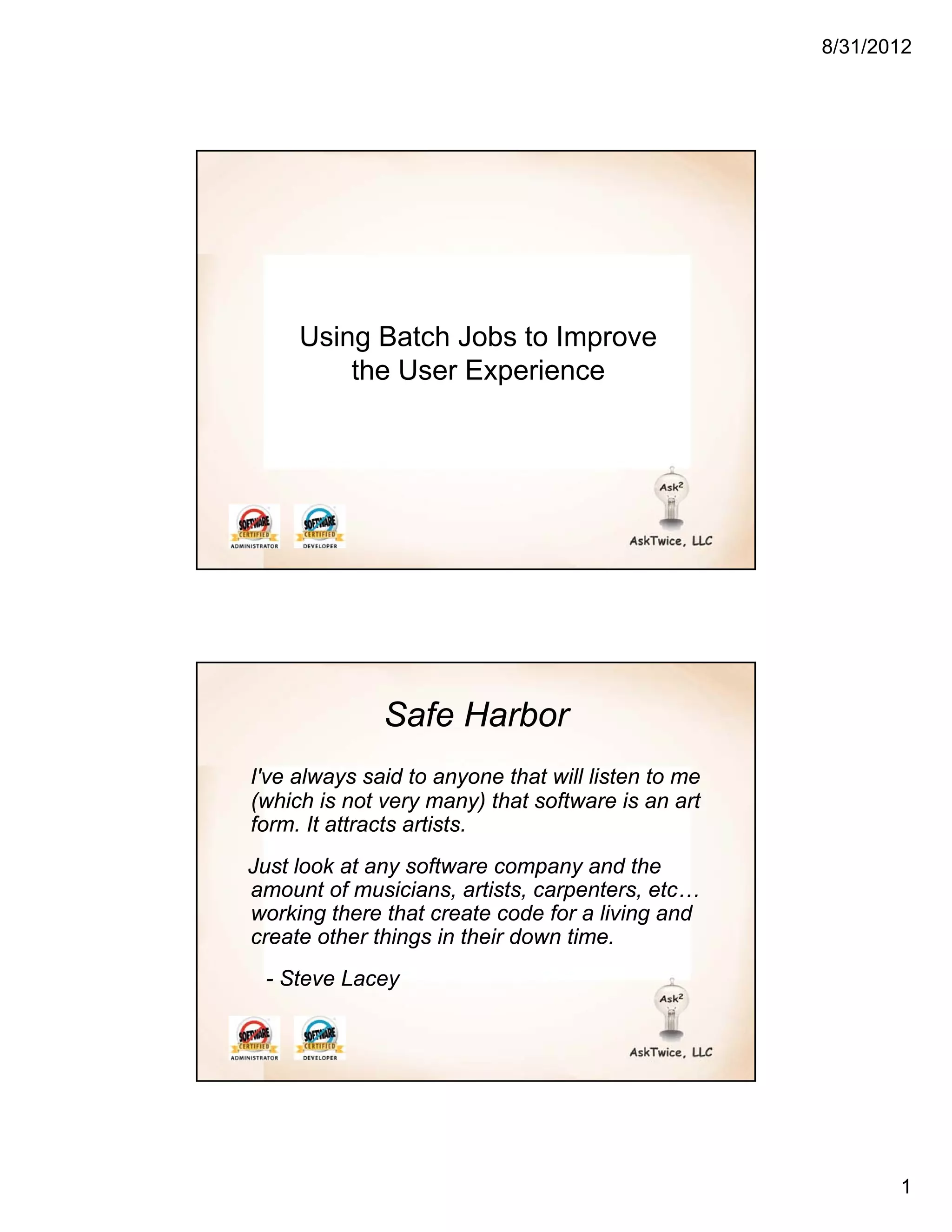 The document discusses using batch Apex jobs to improve the user experience by offloading long-running or complex processes asynchronously. It provides examples of scenarios where batch Apex would be useful, including updating 324k accounts, nulling a field on 142k opportunities, and changing record types on opportunities. The document also includes sample batch Apex code to implement these scenarios and discusses testing and monitoring batch jobs.