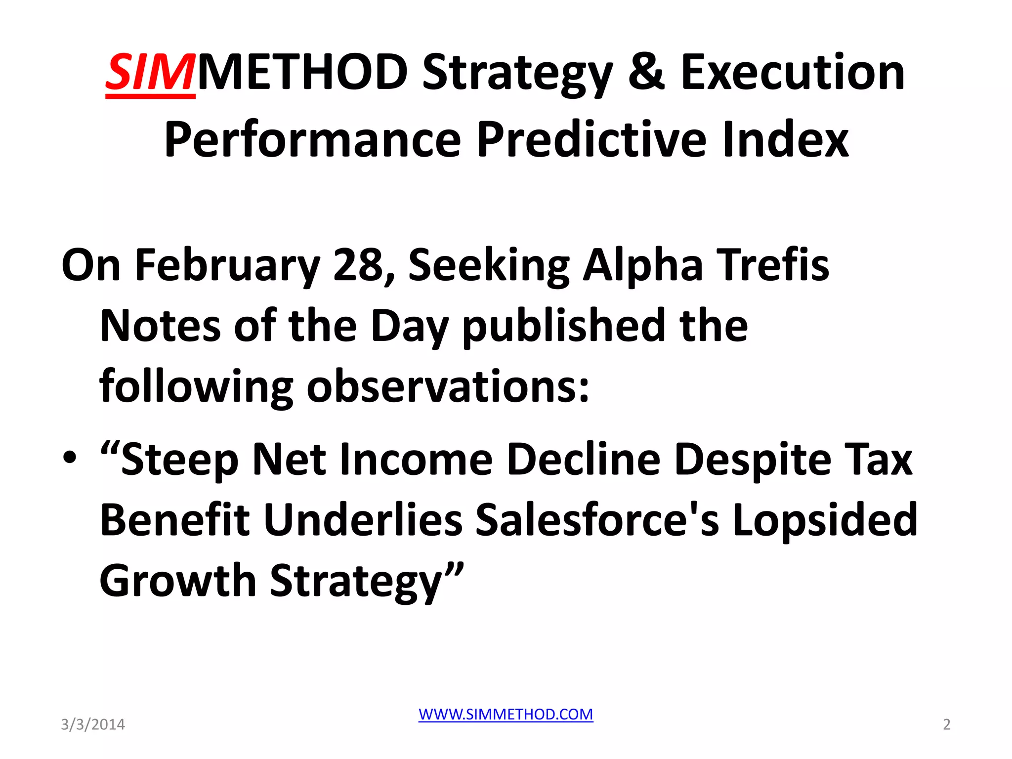 The document discusses Salesforce's corporate performance, highlighting a significant net income decline and operating loss, alongside mounting operational expenses that affect profit margins. It emphasizes the need for improved metrics and analytics to accurately measure corporate strategy and execution, suggesting that current methods fail to provide consistent visibility at the C-level. Additionally, the document outlines Simmethod's approach to creating industry-agnostic performance indices to help businesses better understand their competitive landscape and identify potential risks and opportunities.