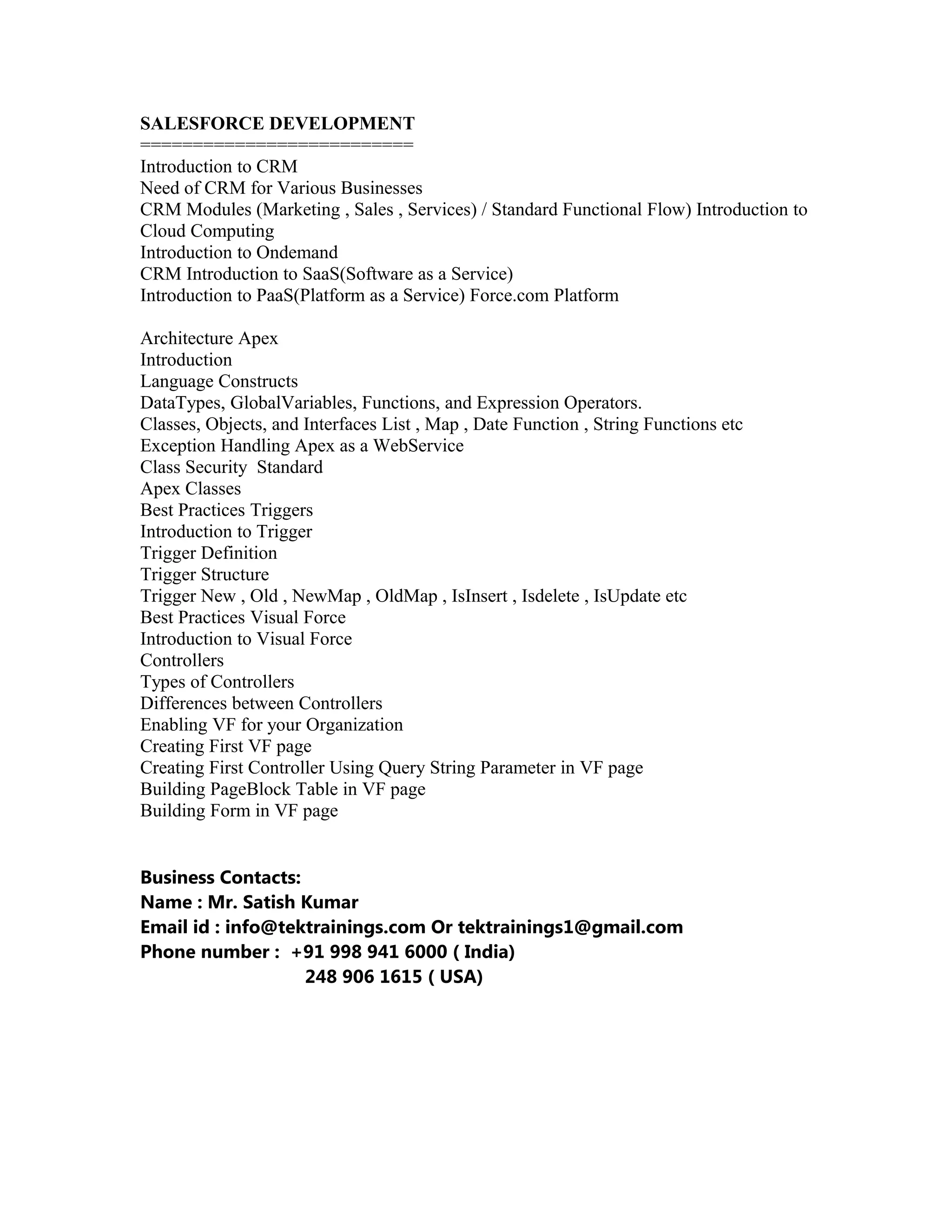 This document provides an introduction to Salesforce development including CRM modules, cloud computing, Force.com platform architecture, Apex programming language, triggers, and Visualforce. It discusses the need for CRM in businesses, standard CRM modules and flows, introduction to concepts like SaaS and PaaS. It also summarizes Apex constructs, data types, classes, exceptions, Apex as web services. Visualforce topics covered include controllers, page blocks, forms. Contact details are provided at the end.