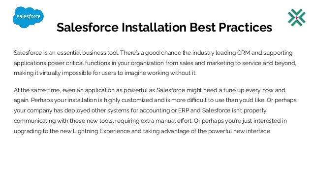 The document outlines best practices for Salesforce installation, emphasizing its vital role in business operations across various departments. It highlights potential issues such as difficulties in customization, lack of system integration with accounting or ERP tools, and the need for better user experience through upgrades to the Lightning interface. Key concerns include data accuracy, user notifications, departmental collaboration, and management access to reports, prompting the need for strategic improvements in Salesforce usage.