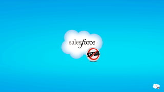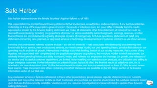 The document presents Salesforce's innovation strategies, highlighting the risks associated with forward-looking statements regarding their services and products. It discusses the growth of mobile devices in the workplace, the impact of IT debt, and features of their cloud platform, including application development and social identity solutions. Additionally, it emphasizes the importance of their marketplace, AppExchange, in enabling enterprise app integration.