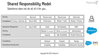 does not do all of it for you… Copyright © 2025 Platinum7 Foundational International Infrastructure Hardware Compute Storage Scalability Availability Datacentre Security Security Foundational Network (inc encryption) Server (inc encryption) Administrative Capacity High Availability Disaster Recovery Operational Management Audits Site Reliability CSIRT Secure SDLC Security Foundational Persona Level Record Level Field Level Performance Monitor / Audit Backup / Archive Secure SDLC Org Level Privacy / Data Gov Customer