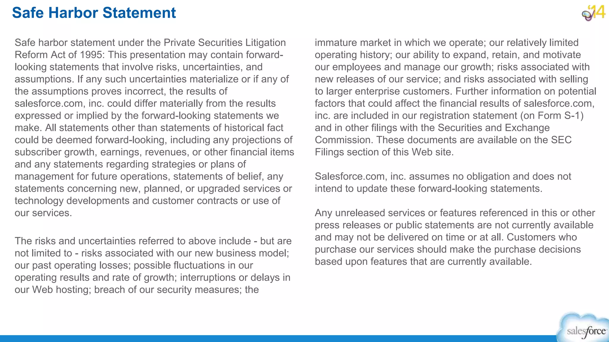 The document provides an overview of Salesforce's Summer '14 release, emphasizing forward-looking statements and associated risks related to performance and operational growth. Key features include enhancements to mobile functionality, Salesforce Chatter, and general system usability such as increased attachment limits and new reporting capabilities. Release milestones, sandbox access details, and a comprehensive list of new features and enhancements are outlined for user reference.