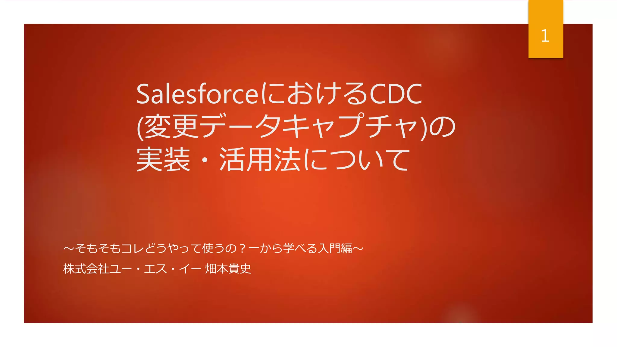 SalesforceにおけるCDC (変更データキャプチャ)の 実装・活用法について ~そもそもコレどうやって使うの?一から学べる入門編~ 株式会社ユー・エス・イー 畑本貴史 1