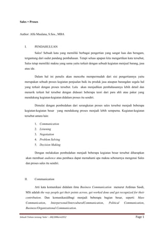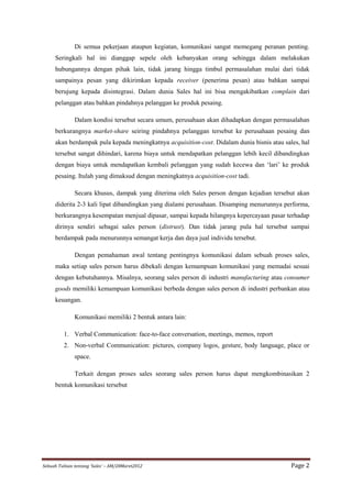 Tulisan ini membahas tentang sales sebagai proses yang terdiri dari beberapa kegiatan kunci seperti komunikasi, mendengarkan, negosiasi, penyelesaian masalah, dan pengambilan keputusan. Komunikasi dijelaskan sebagai komponen penting dalam sales karena kurangnya komunikasi dapat menyebabkan keluhan pelanggan atau bahkan pelanggan beralih ke pesaing. Sales person harus memiliki kemampuan komunikasi yang baik,