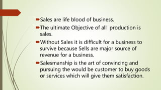 This document discusses salesmanship and the qualities of a good salesman. It begins by stating that sales are essential for business survival and are a major source of revenue. Salesmanship is defined as convincing customers to purchase goods or services that will satisfy them. The advantages of salesmanship include locating prospective buyers, creating demand, and providing feedback. A good salesman must have strong personal, mental, social, and vocational skills. This includes being well-spoken, intelligent, likable, patient, polite, and having expertise in selling techniques. The steps in the selling process are also outlined as pre-sale preparation, prospecting, approaching, presentation, dealing with objections, closing the sale, and follow-up.