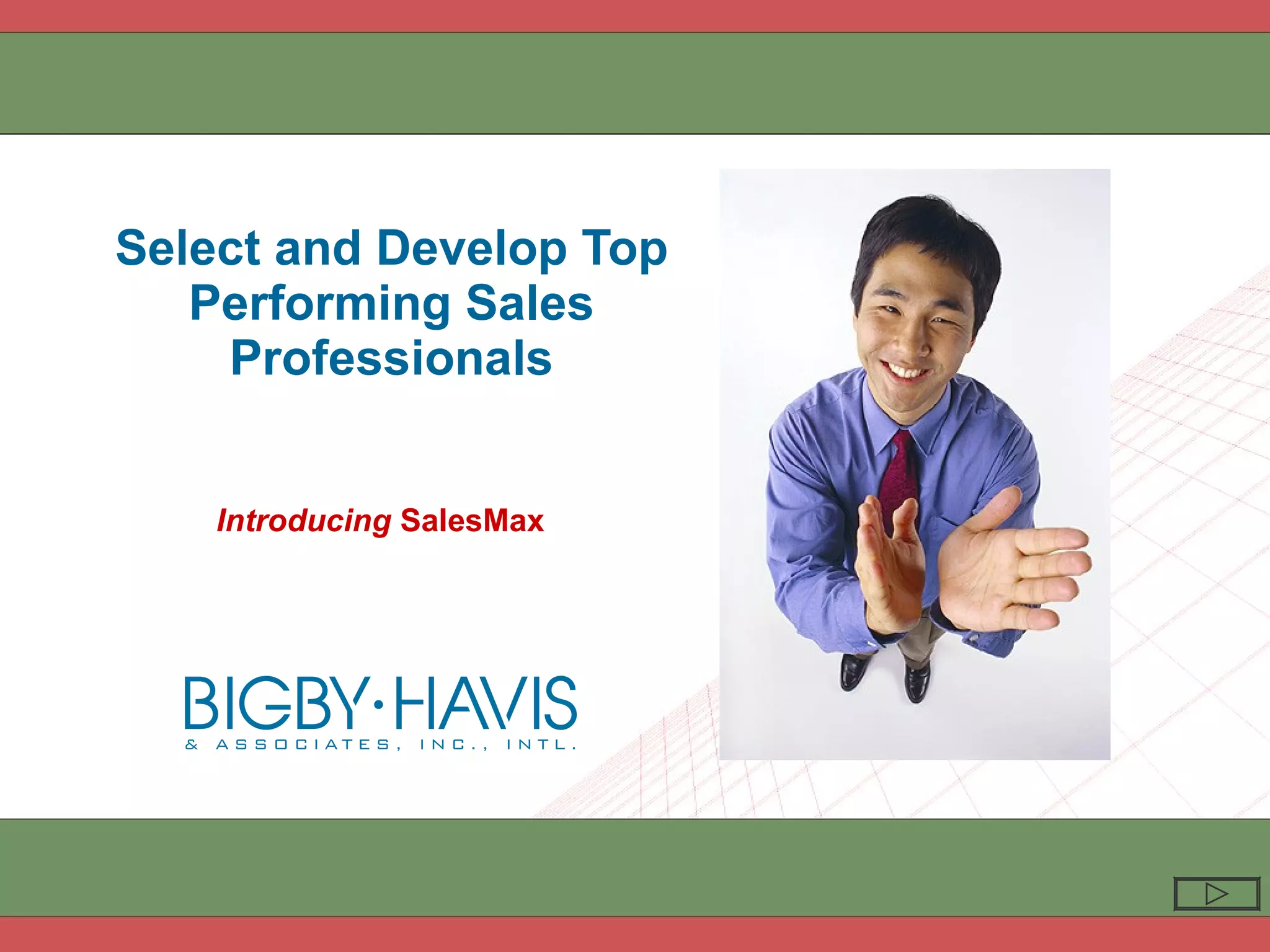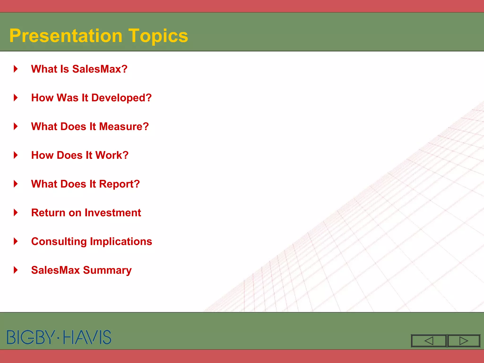 SalesMax is a web-based assessment tool designed to identify sales candidates who are most likely to succeed and help current sales employees improve. It measures eight personality characteristics, sales knowledge, and motivations. Candidates complete an online survey that takes about an hour. Scores are compared to a validated success profile to generate a selection or development report with feedback and guidance. Validation studies found representatives scoring higher on the success index had significantly better sales results, providing a return on investment.