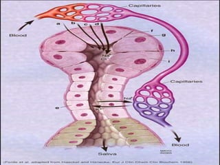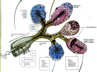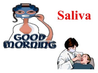 This document provides an overview of saliva, including its composition, secretion, and functions. It discusses the major and minor salivary glands, noting their locations and contributions to total saliva production. The composition of saliva is described, including water, enzymes, proteins, electrolytes, and other components. Factors that influence saliva secretion and composition are outlined. The document examines the mechanisms of saliva secretion and formation. Finally, it details the various protective, digestive, sensory, and other important functions of saliva in the mouth and body.
