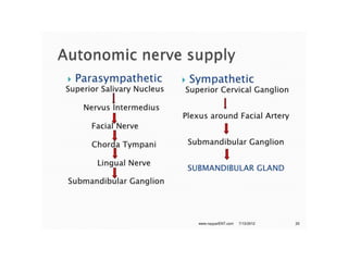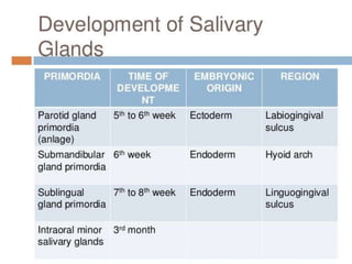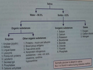 The document discusses the salivary glands and their secretions. It describes the three major salivary glands - the parotid gland, submandibular gland, and sublingual gland - and their locations and contributions to saliva production. It also outlines the major cell types in salivary glands, the composition and flow rate of saliva, and its functions. Furthermore, it explains the mechanisms of saliva formation, including primary secretion, modification in the ducts, and reflex regulation in response to physiological conditions like the cephalic, buccal, esophageal, gastric, and intestinal phases. In summary, the document provides an overview of the anatomy, physiology and functions of the sal