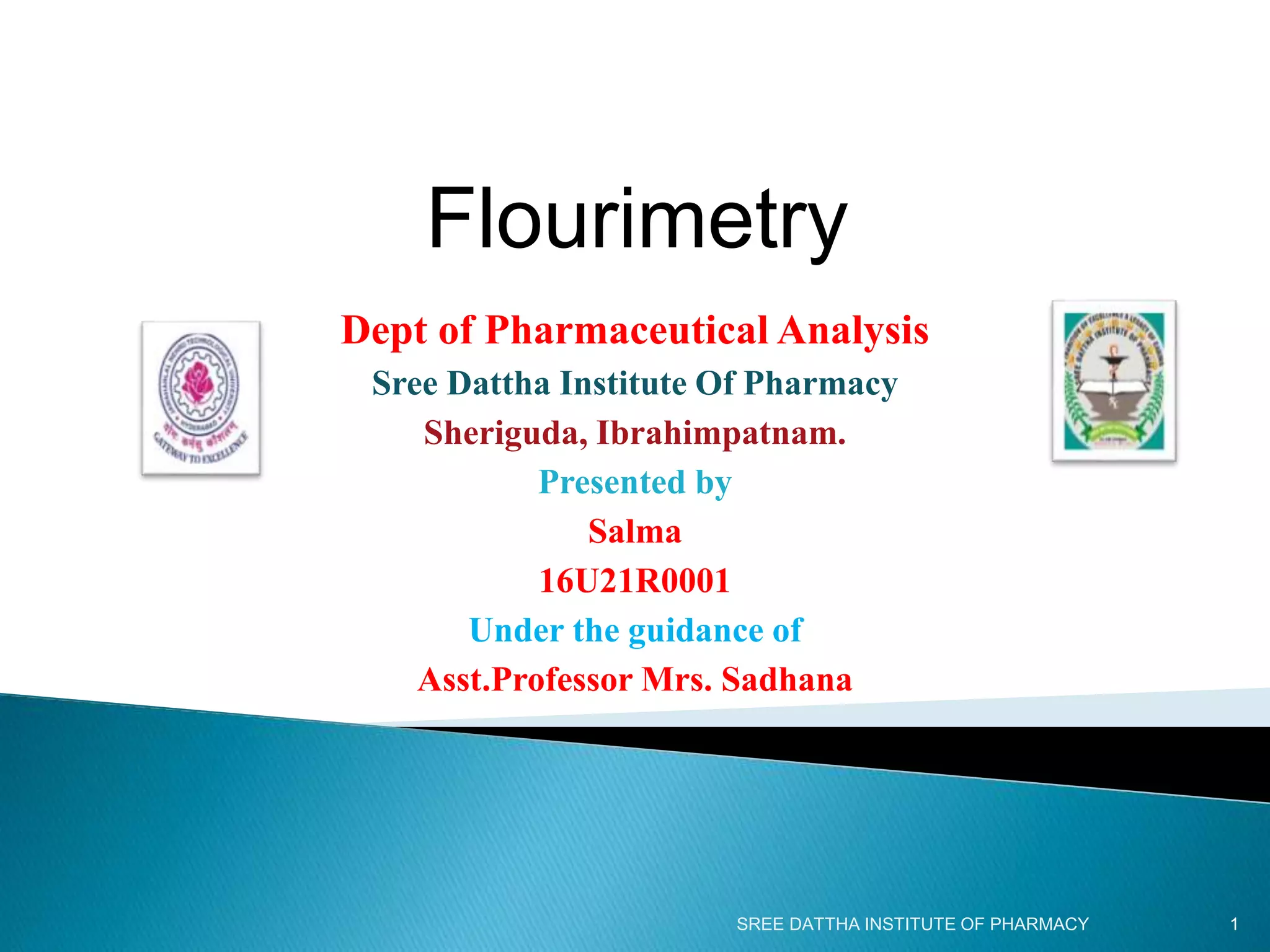 This document discusses fluorescence and fluorimetry. It begins with an introduction and overview of fluorescence as the emission of radiation when molecules are excited by radiation at certain wavelengths. It then discusses fluorimetry as the measurement of fluorescence intensity at a particular wavelength using a fluorimeter or spectrofluorimeter. Finally, it covers factors influencing fluorescence intensity, types of quenching, instrumentation components, and applications of fluorimetry in pharmaceutical analysis.