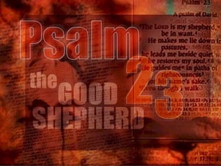 The document is an introduction to a presentation themed on Psalm 23, featuring one title and five background slides. It is a free sample intended for users of ebibleteacher.com. The content is available through the website videoscriptures.com.
