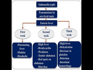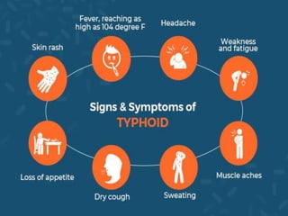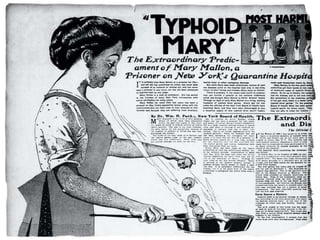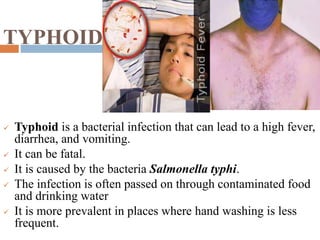 Typhoid is a bacterial infection caused by Salmonella typhi. It causes high fever, diarrhea, vomiting and can be fatal if untreated. The bacteria spreads through contaminated food and water. Mary Mallon was the first documented healthy carrier of typhoid in the United States in the early 1900s, infecting over 100 people and contributing to typhoid outbreaks by working as a cook while infected. Diagnosis involves culturing the bacteria from stool samples on selective media like XLD agar where Salmonella typhi colonies appear red.
