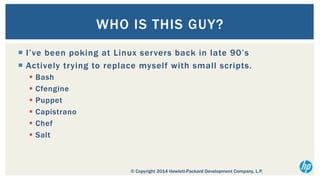 The document discusses the installation of OpenStack using SaltStack, detailing the author's background and objectives for the presentation. It covers important configurations, file structures, and best practices for SaltStack management in OpenStack deployments. Additionally, it emphasizes the importance of continuous learning and collaboration in the tech community.