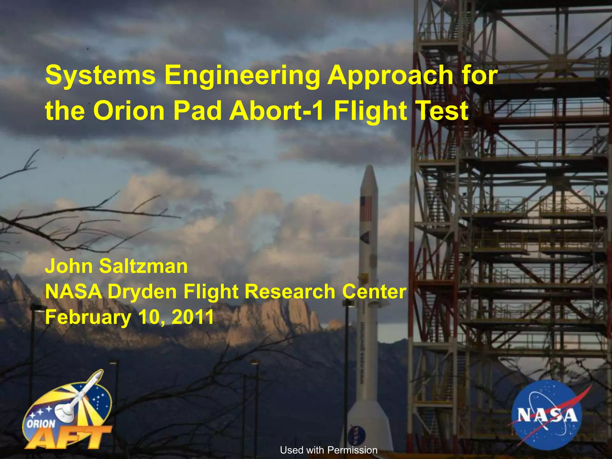 This document discusses the systems engineering approach used for the Orion Pad Abort-1 (PA-1) flight test. It outlines how the project gathered requirements from multiple stakeholders, organized teams across different organizations into a single project-centric culture, and defined the system architecture and verification process. The presentation provides lessons learned on transitioning from separate organizational cultures to an integrated project approach and the need for community organizers to advocate for the project. It aims to serve as a future reference for applying systems engineering principles.