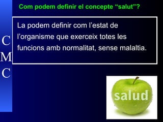 La podem definircom l’estat de l’organisme que exerceix totes les funcions amb normalitat, sense malaltia. Com podem definir el concepte “salut”? C M C