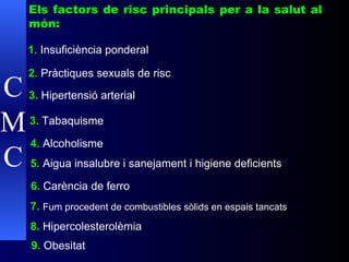 1. Insuficiènciaponderal Els factors de risc principals per a la salut al món: 2. Pràctiques sexuals de risc 3. Hipertensió arterial 3. Tabaquisme 4. Alcoholisme 5. Aigua insalubre i sanejament i higiene deficients 6. Carència de ferro 7. Fum procedent de combustibles sòlids en espais tancats 8. Hipercolesterolèmia 9. Obesitat C M C