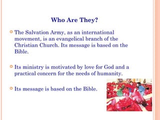 The Salvation Army is an international Christian church and charity that provides social assistance to those in need regardless of race, age, or background. Its mission is to preach the gospel of Jesus Christ and meet basic human needs through services like food, clothing, and counseling. It was founded by William Booth and is funded through donations, fundraising campaigns, and community partnerships. The Salvation Army aims to holistically address both practical and spiritual needs as part of its mandate.