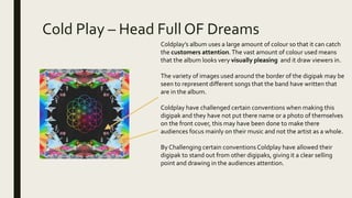 The document discusses conventions used in digipak album cover designs. Several artists are highlighted: