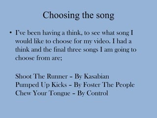 The document outlines plans for filming a music video. It discusses choosing a song, researching other music videos for inspiration, and developing ideas for the video. The key ideas considered are filming the band's performance, having the band follow a character around a house as they perform, and simply filming the band's practice session and editing it into a video. Photos of potential outfits are also shared. The document decides on filming the band's practice and editing it with effects. It then discusses creating additional materials like an album cover and magazine page to promote the music.