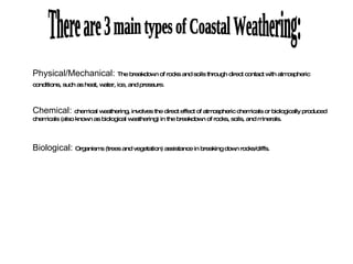 The document discusses three main types of coastal weathering: physical/mechanical, chemical, and biological. Physical weathering breaks down rocks through direct contact with heat, water, ice, and pressure. Chemical weathering involves the breakdown of rocks from atmospheric or biologically produced chemicals. Biological weathering involves the assistance of organisms like trees and vegetation in breaking down rocks and cliffs.