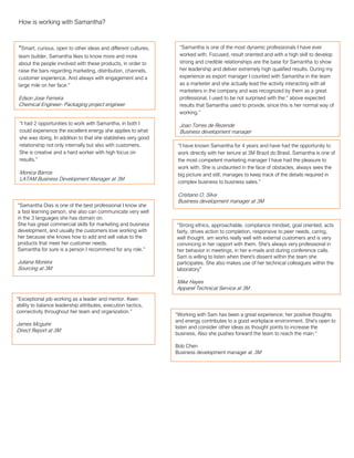 Samantha Dias is a global business leader at 3M responsible for their Scotchgard and Thinsulate brands in the apparel industry. She has over 15 years of experience in marketing, business development, and sales roles at 3M in Brazil and the US. Her experience includes developing marketing plans, managing product launches, and leading cross-functional teams. She holds a Bachelor's degree in Business and a Master's degree in Marketing.