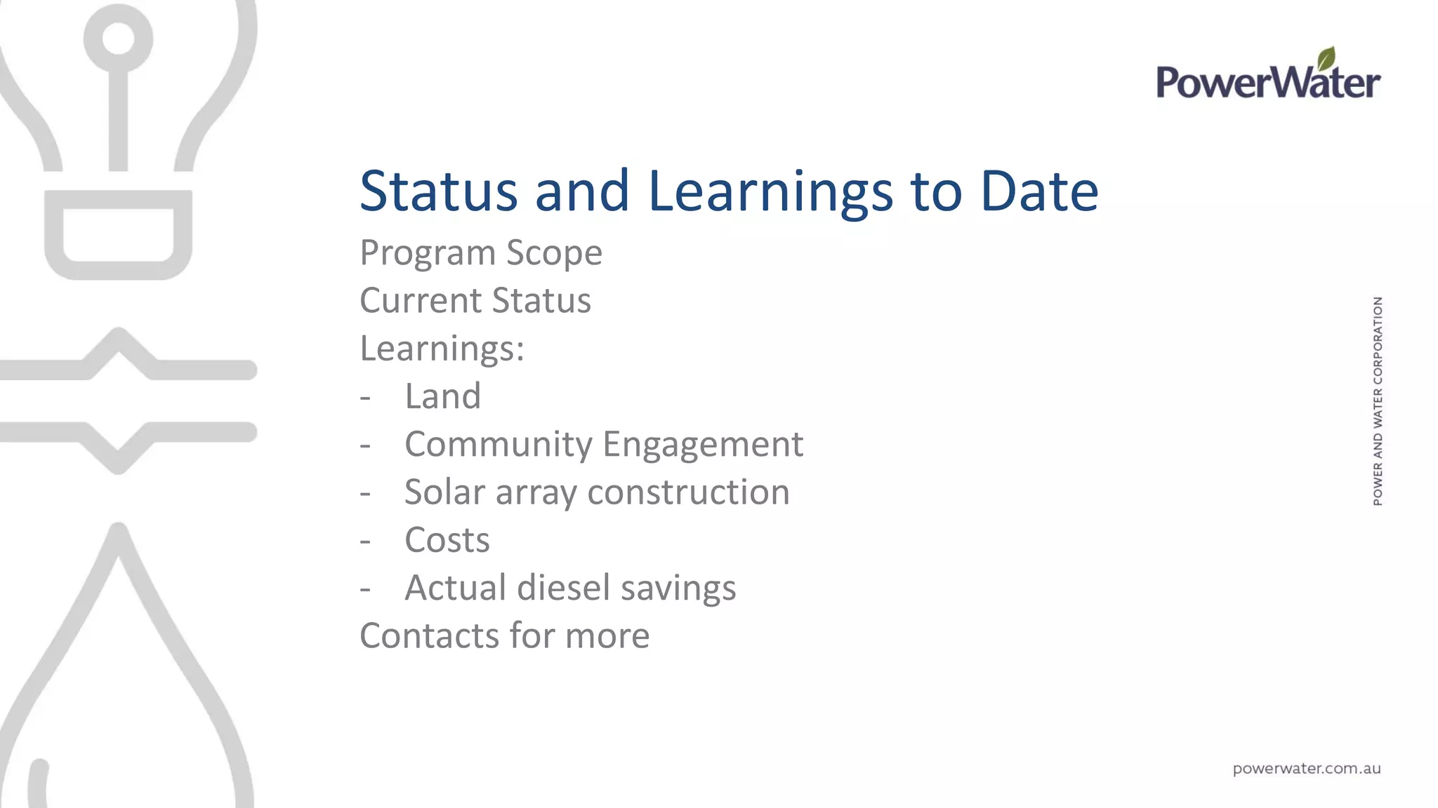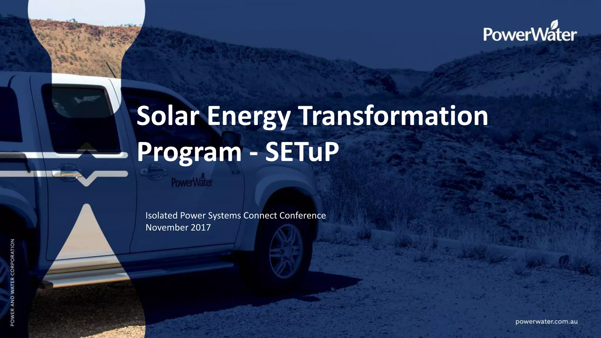 The document summarizes the status and learnings from the Solar Energy Transformation Program - SETuP, which aims to install solar PV and energy storage systems in over 50 remote Indigenous communities currently reliant on diesel power. It provides details on the program scope, current status of installations, key learnings regarding land access, community engagement, construction costs, and actual diesel savings observed. Performance data from the first tranche of installations is also presented. The document concludes by providing contacts for those seeking more information.