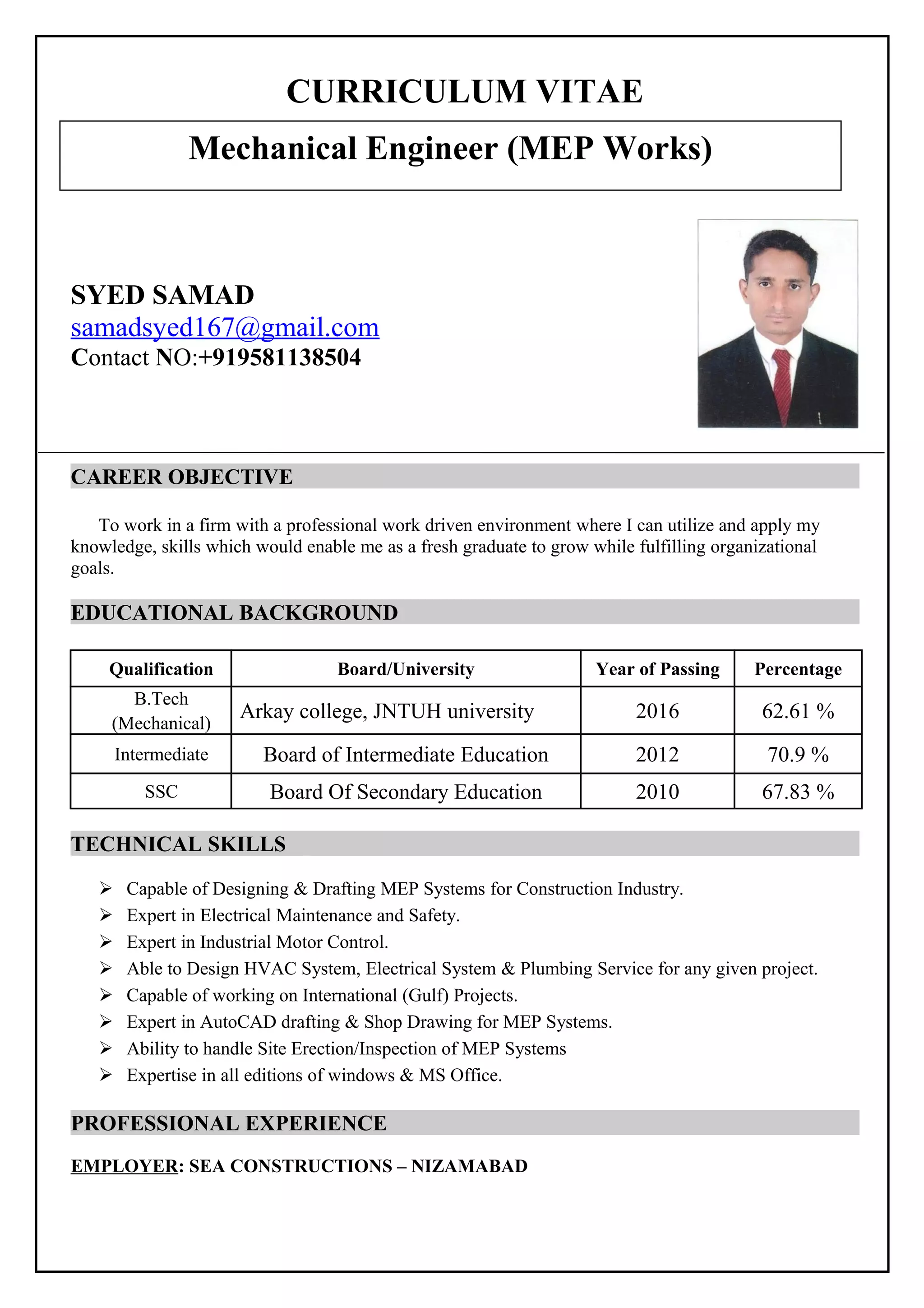 Syed Samad is a mechanical engineer seeking a position utilizing his knowledge and skills. He has a B.Tech in mechanical engineering with over 1 year of experience as an MEP engineer. His skills include designing HVAC, electrical, and plumbing systems using AutoCAD. He is proficient in MS Office and aims to contribute to organizational goals in a professional environment.