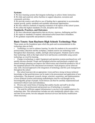 Sam Rayburn High Schools' technology plan aims to improve student learning, teaching, and support through technology integration. The plan outlines 5 objectives: 1) improve student learning through digital content and ensuring technology literacy; 2) improve staff technology skills; 3) improve efficiency through technology use; 4) ensure equitable technology access; and 5) evaluate technology use through research. The plan provides targets, actions, and responsibilities for each objective over three years to enhance instruction and operations through strategic technology investments and professional development.