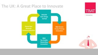 This document provides information about funding and tax incentive programs in the UK to support innovation and research and development. It discusses the Seed Enterprise Investment Scheme (SEIS) and Enterprise Investment Scheme (EIS) which provide tax relief for equity investments in small companies. It also summarizes R&D tax credits that reward innovation, the Patent Box that lowers taxes on profits from patented inventions, and various grant programs from Innovate UK including Smart Grants. The document provides guidance on eligibility and claiming these different innovation support programs in the UK.