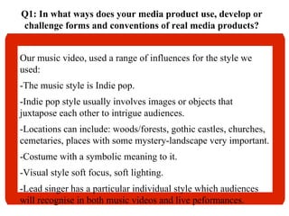 The document discusses the production of a music video for an indie pop band. It describes how the video draws on conventions of the genre, such as soft lighting and locations like forests. Feedback from audiences suggested improving some blurry shots and overly long nature shots. The combination of the video and supplementary materials like a digipak was effective in maintaining the artistic style and focusing on the lead singer. Media technologies like Adobe Premiere and Photoshop were used to edit footage, add effects, and design supplementary materials.