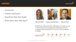 The document discusses best practices for monitoring the health of web applications, particularly focusing on IIS and SharePoint. It outlines key performance indicators and metrics to track, such as login performance and application pool functionality, and suggests monitoring tools for different web apps including Apache and Tomcat. Additionally, it provides information on upcoming webinars and resources related to optimizing web app performance.