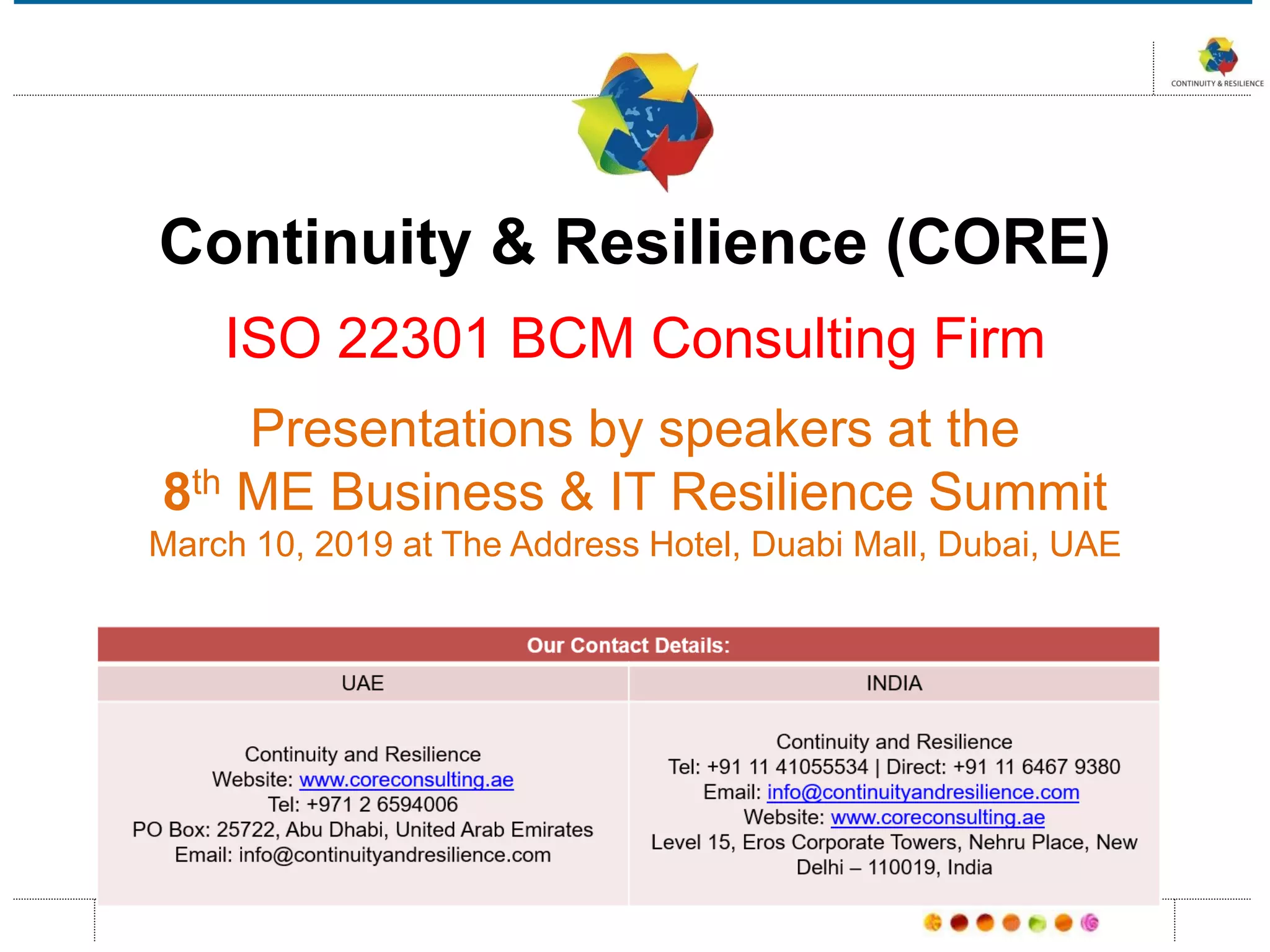 The document outlines the BCM framework and consulting services presented at the 8th ME Business & IT Resilience Summit, emphasizing the importance of business continuity management (BCM) and crisis management for member organizations affiliated with SAMA in Saudi Arabia. It details the requirements for implementing BCM practices, roles and responsibilities, necessary training courses, and strategies for crisis and disaster recovery. The framework aims to ensure effective response to disruptions, continuous improvement, and senior management accountability in maintaining operational resilience.