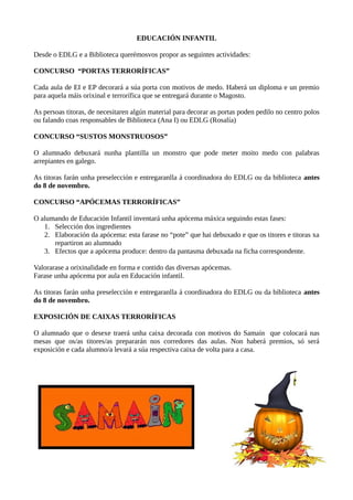 Cada aula de EI e EO decorará a súa porta con motivos de medo. Haberá un diploma e un premio