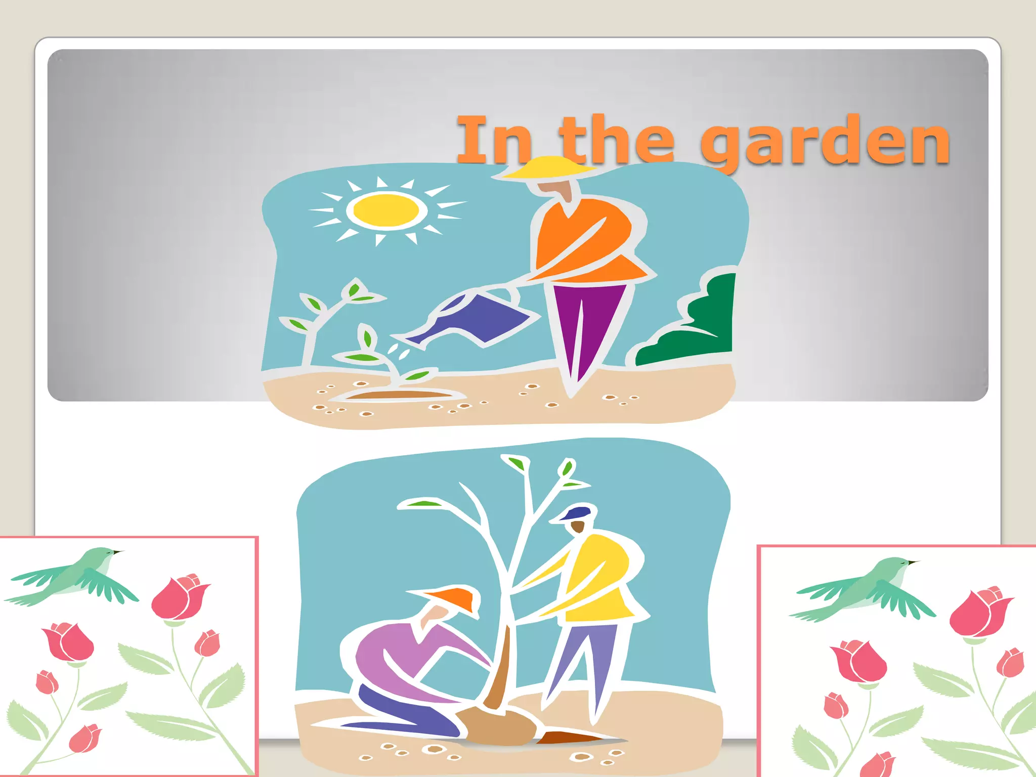 The document describes various things found in a garden including seeds, spiders, leaves, houses, flowers, bees, and berries. A scarecrow is also mentioned as being in the garden.