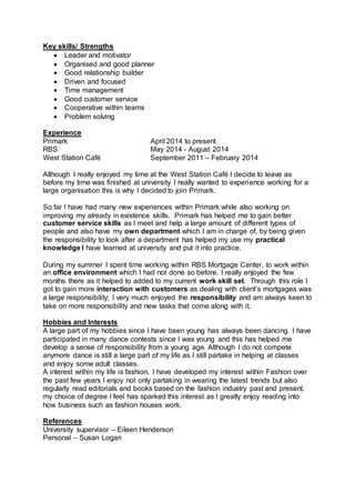 Samantha Rae graduated from the University of the West of Scotland with a BA in Business Management with distinction. She has experience working in retail, banking, and food service. Currently she works at Primark, where she is responsible for her own department and has improved her customer service and practical business skills. She is organized, a strong leader and motivator, and enjoys taking on new responsibilities.