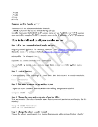 The document provides instructions for installing and configuring a Samba file sharing server on CentOS 7. It describes installing Samba packages, creating a shared directory, configuring user access, editing configuration files, starting services, adding firewall rules, and connecting from Windows and Linux clients. The key steps are installing Samba packages, configuring shares and permissions in smb.conf, starting smb and nmb services, enabling them to start on boot, and connecting clients to the shared directory.