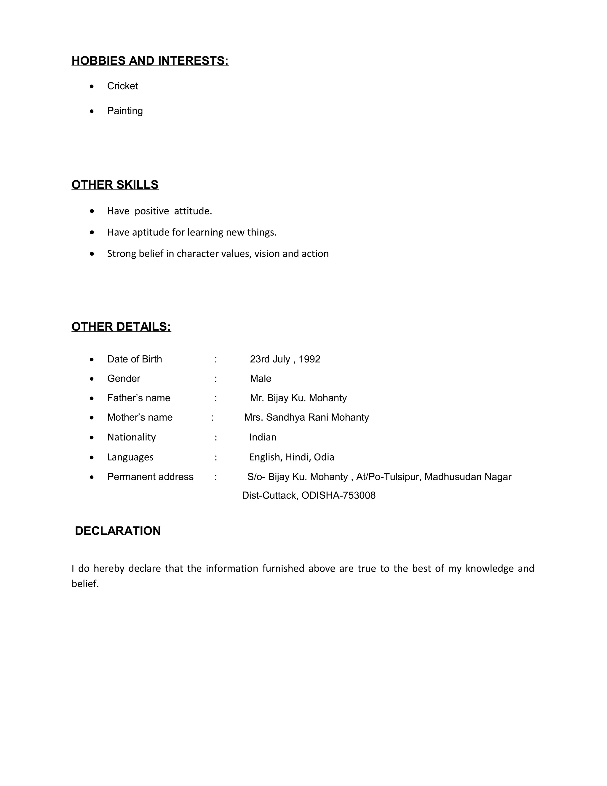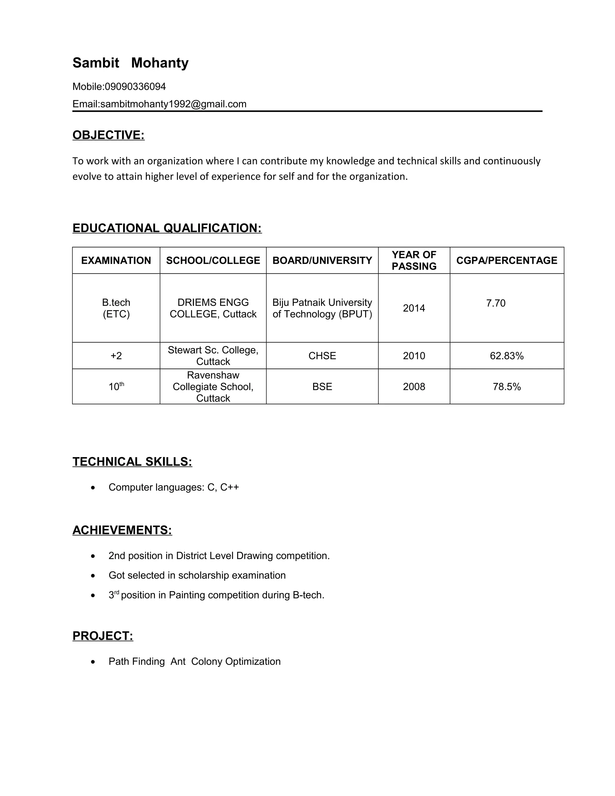 Sambit Mohanty is seeking a position where he can contribute his technical skills and continuously improve his experience. He has a B.Tech in ETC from DRIEMS Engineering College with a 7.70 CGPA. His technical skills include C and C++. He has received achievements such as 2nd position in a district-level drawing competition and 3rd position in a painting competition during his B-tech. His hobbies include cricket and painting.